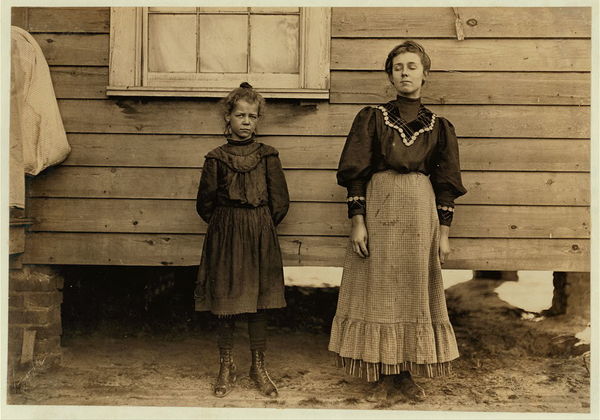 Maple Mills, Dillon, S.C. Lonnie Baker (tallest). Has doffed 4 years. Gets 40 cents a day. Bertie Baser--10 years old. 3 years in mill. Runs 3 sides = 30 cents a day. Location: Dillon, South Carolina.