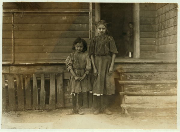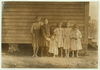 Dillon Mill (tallest) Lizzie McKenzie, Has helped 1/2 year. Mamie Baxley (holding baby). Been in mill 3 years. Runs 4 sides = 40 cents a day. Maud & Daisy "help." Location: Dillon, South Carolina.