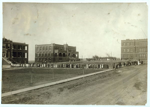 Marching to supper, Training School for Deaf Mutes. Crowded conditions. See Gibbons report. Location: Sulphur, Oklahoma / Lewis W. Hine.