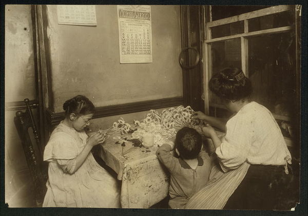4 P.M. John Sachatello, a barber with a steady job helping family make flowers, 302 Mott St. Making "bluettes" at $2.00 a gross. Makes $12.00 to $13.00 a week when all work. Mary 5 yrs. old. Tommy 7 yrs. old. Location: New York, New York (State)