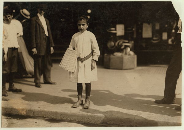Newsboys and newsgirl. (Mary Malchade) (9 years old.) Getting afternoon papers, Park Row. Location: New York, New York (State)