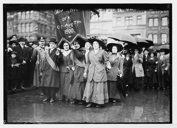 Labor Day (May Day) parade, crowd in rain in street, New York