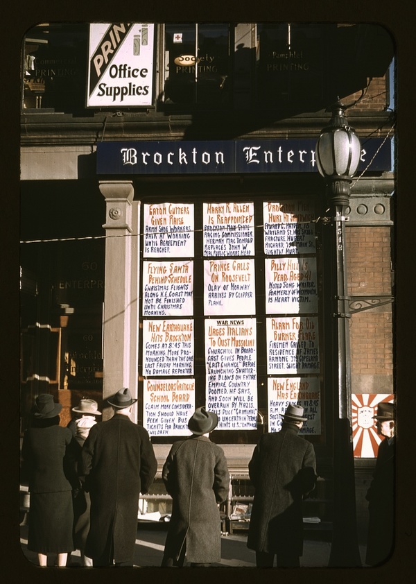 Men reading headlines posted in street-corner of Brockton Enterprise newspaper office, Brockton, Mass.