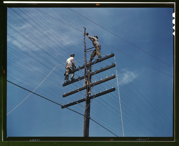 Men working on telephone lines, probably near a TVA dam hydroelectric plant