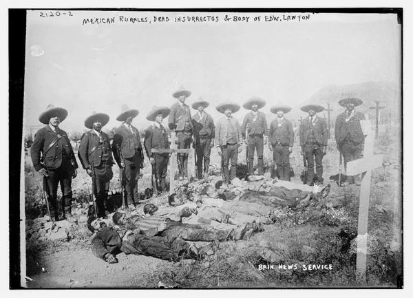 Mexican rurales, dead indurrectos, and body of Edw. Lawton lying in pit, with surrounding guard
