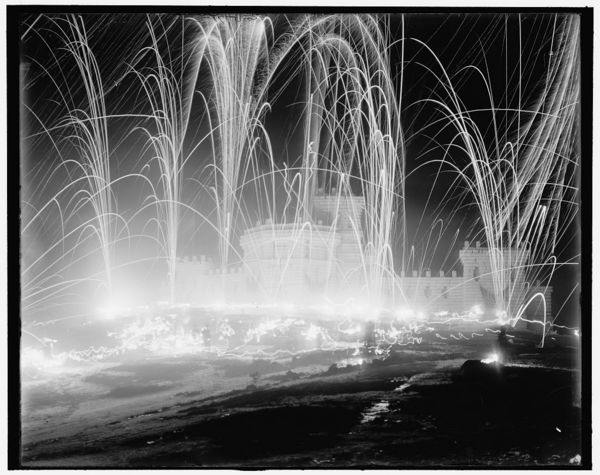 Midwinter carnival, the ice fortress after the thaw, 1909, Upper Saranac Lake, N.Y.