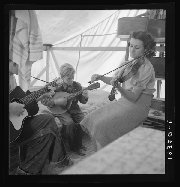 Migrant family from Arkansas playing hill-billy songs. Farm Security Administration emergency migratory camp. Calipatria, California