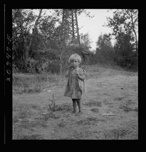 Migratory child in squatter camp before hop season opens. Her little brothers work in the field. Washington, Yakima Valley