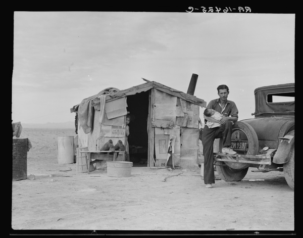 Car of drought refugee on edge of carrot field in the Coachella Valley. California