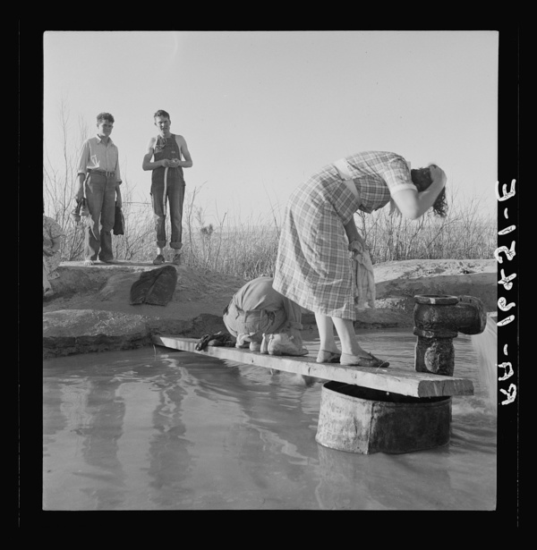 Migratory workers from Oklahoma washing in hot spring in the desert. Imperial Valley, California