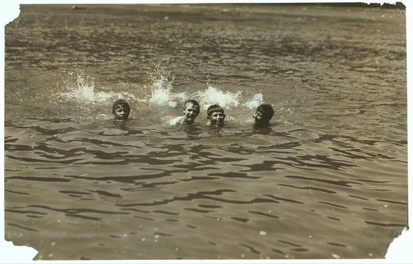 Mill boys' recreation. A Sunday swim. Base-ball on Sunday is tabooed here. Sunday-school and church are well attended. Loafing around, playing marbles, and swimming seem to be the only respite from the week's work. Location: Fries, Virginia.
