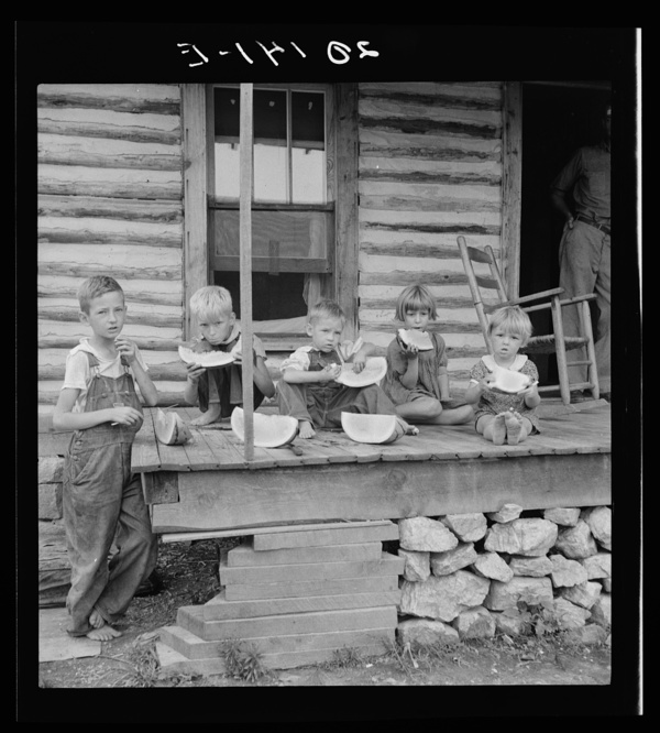 Millworker's children eating watermelon on porch of rented house. Six miles north of Roxboro, Person County, North Carolina