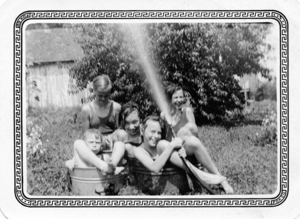 Moffett and Moores having fun in the backyard. Martha McGinty joining.