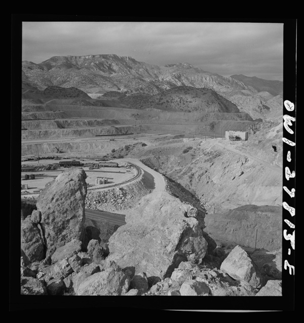Morenci, Arizona. A huge electric shovel at an open-pit copper mine loading an ore train on its way to the smelter plant of the Phelps Dodge mining corporation