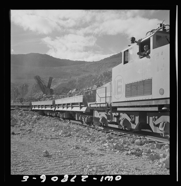 Morenci, Arizona. Loading copper ore from an open-pit mine on an ore train on its way to the smelter plant of the Phelps Dodge mining corporation