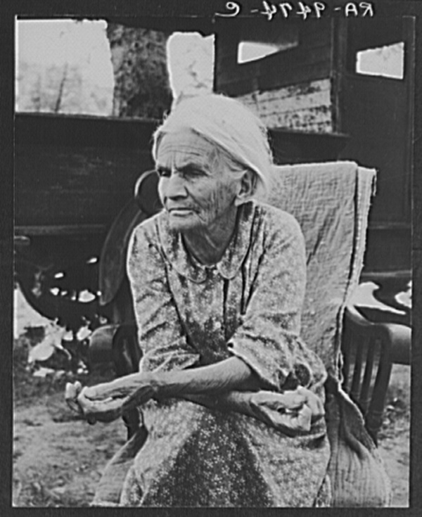 Mother of family camped near a creek bed, panning for gold. "Slept in a bed all my life long till now--sleeping on the ground." Near Redding, California
