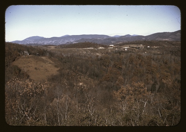 The road along the Skyline Drive, with a light snowfall in the rocks beside, Virginia