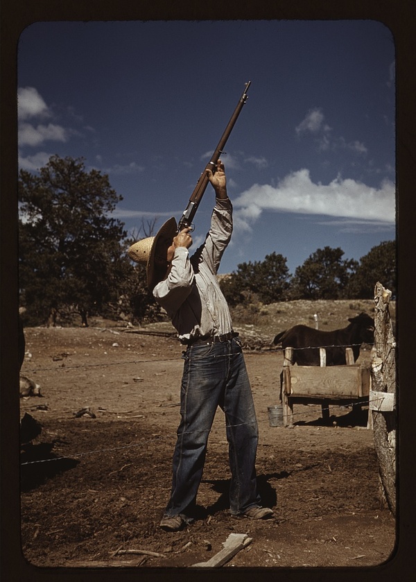 Mr. Leatherman, homesteader, shooting hawks which have been carrying away his chickens, Pie Town, New Mexico