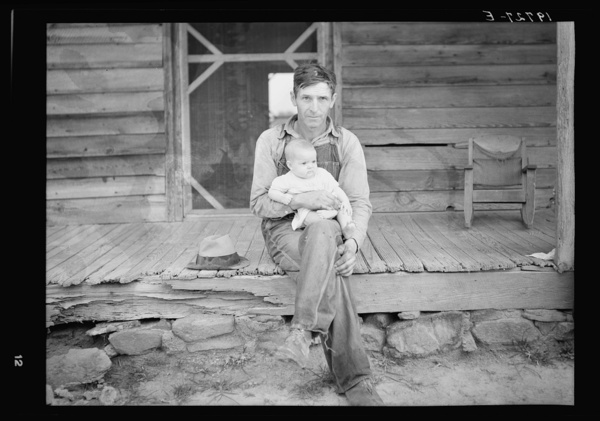 Mr. Whitfield, tobacco sharecropper, with baby on front porch. North Carolina, Person County