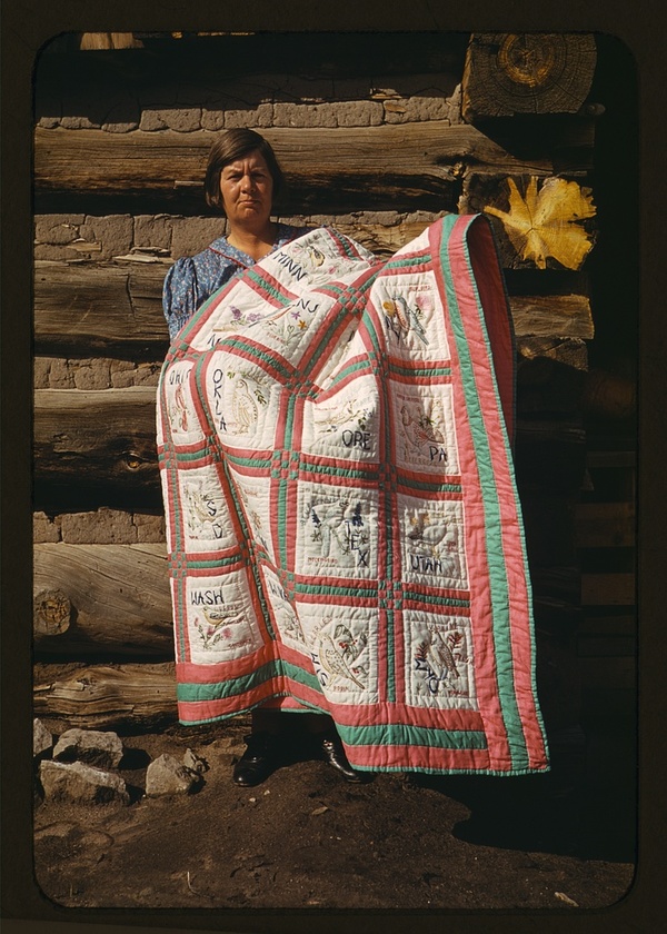 Mrs. Bill Stagg with state quilt, Pie Town, New Mexico