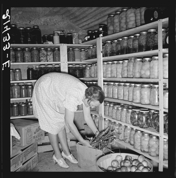 Mrs. Botner arranging her storage cellar. Nyssa Heights, Malheur County, Oregon