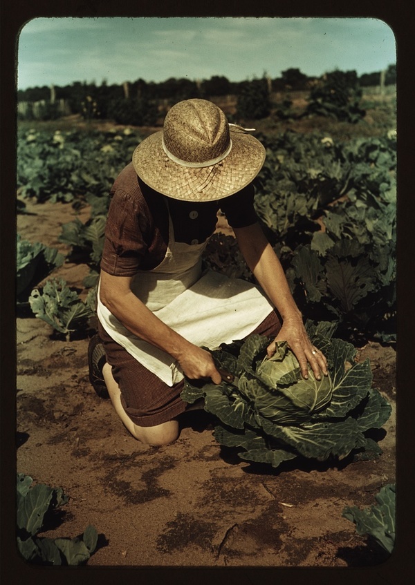 Mrs. Norris with homegrown cabbage, one of the many vegetables which the homesteaders grow in abundance, Pie Town, New Mexico