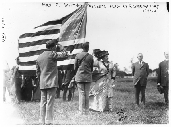 Mrs. P. Whitney presents flag at reformatory, prison congress delegates in background