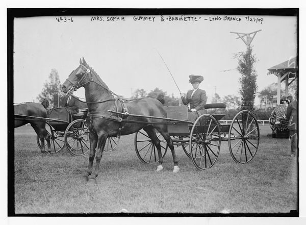 Mrs. Sophie Gummey in horse-drawn hack, drawn by "Babinette", Long Branch