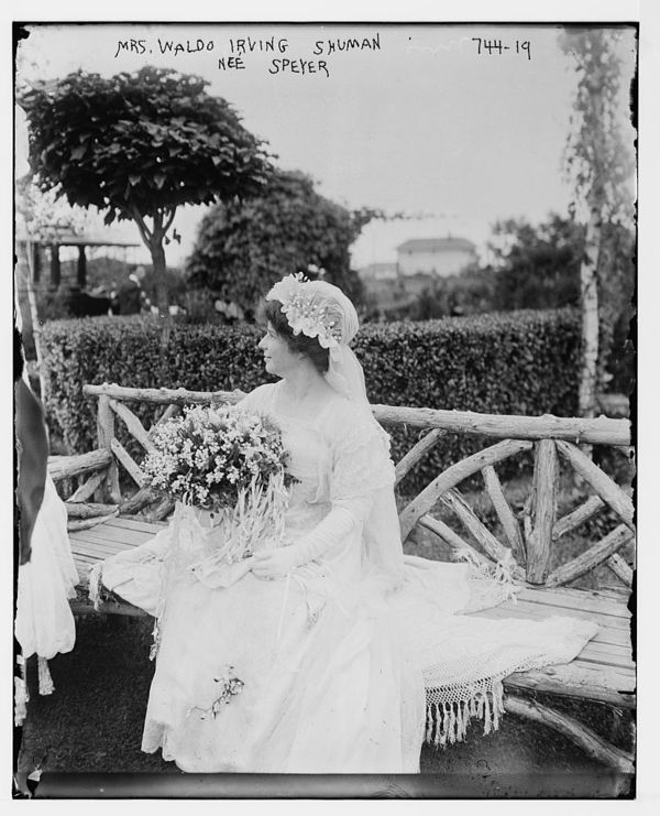 Mrs. Waldo Irving Shuman, nee Speyer, seated on bench, holding bouquet of flowers