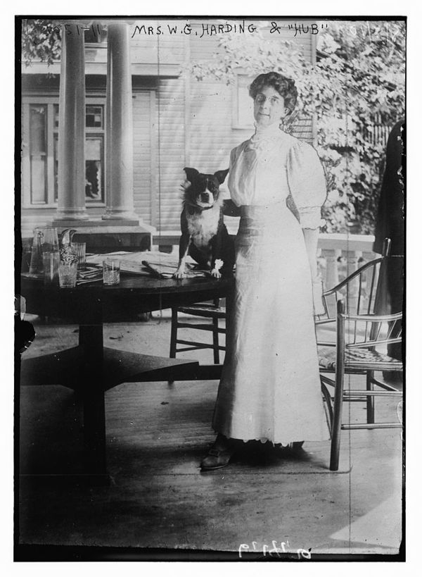 Mrs. W.G. Harding with dog "Hub" who is sitting on table