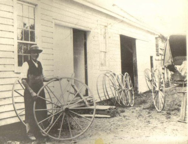 My Great Great Grandfather, taken at his wheelwright shop in 1889.