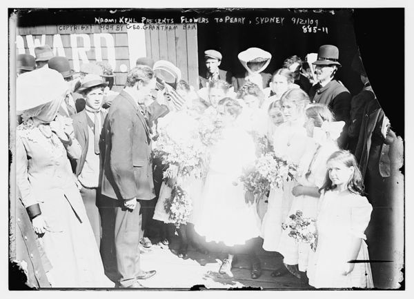 Naomi Kehl and other girls present flowers to Peary, Sydney