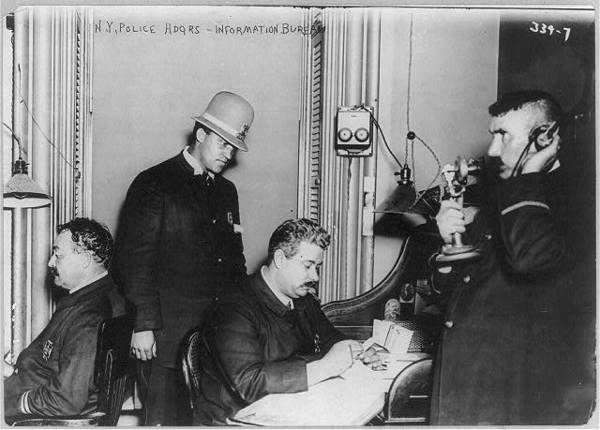 New York City Police Dept. activities: Information Bureau at HQ--4 men at work