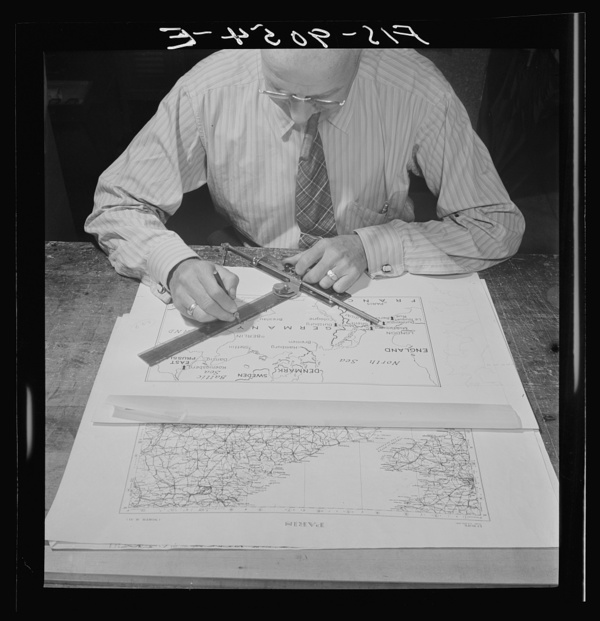 New York, New York. Art department of the New York Times newspaper. Cartographer consults key maps filed for reference in making maps for paper. This man here during last war; claims he can keep at least two countries ahead of the war