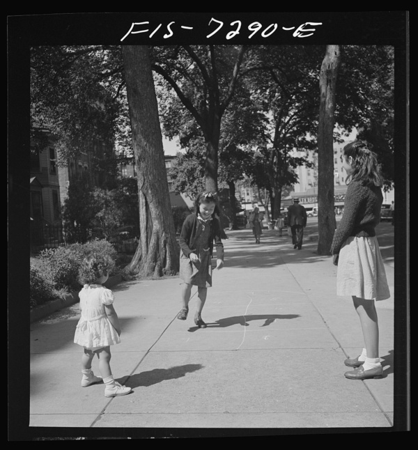New York, New York. Chinese-American girl playing hopscotch with American friends outside her home in Flatbush