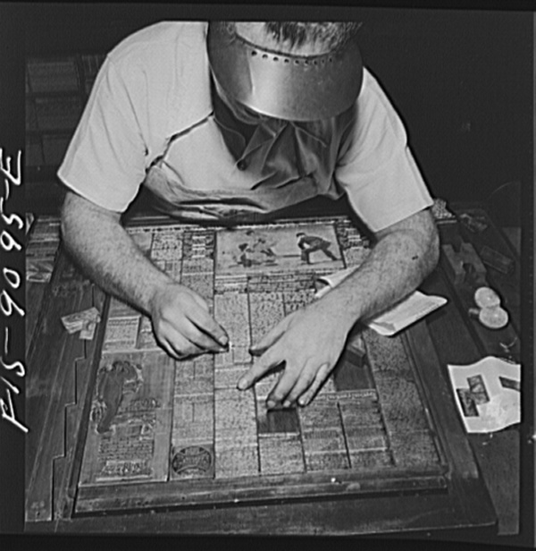 New York, New York. Composing room of the New York Times newspaper. Times daily index to the news is set partly by hand. This man has been doing it for fifteen years