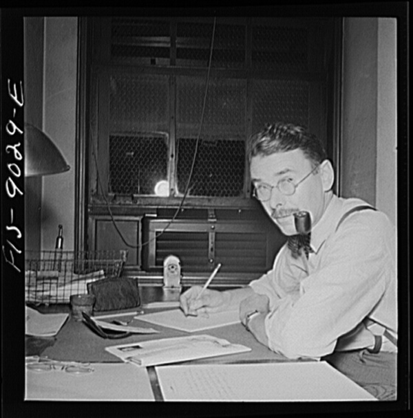 New York, New York. Drama department of the New York Times newspaper. Brooks Atkinson, drama critic, longhanding the review of a new play