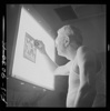 New York, New York. Photo engraving department of the New York Times newspaper. Examining the dots on the screen of a strip negative in the darkroom before it is transferred to a zinc plate