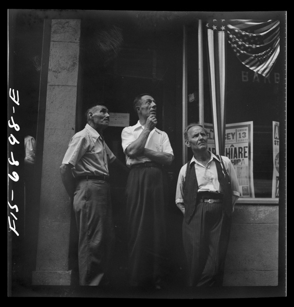 New York, New York. Italian-Americans in the rain watching a flag raising ceremony in honor of the feast of San Rocco at right
