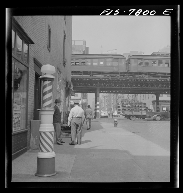 New York, New York. Looking north from the 9th Street station on the Third Avenue elevated railway as a train leaves on the local track