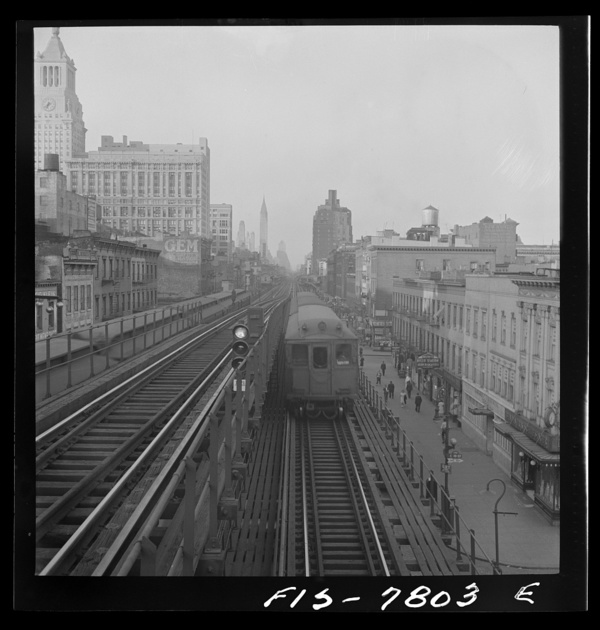 New York, New York. Looking north from the Ninth Street station on the Third Avenue elevated railway as a train leaves on the local track