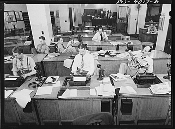 New York, New York. Newsroom of the New York Times newspaper. Reporters and rewrite men writing stories, and waiting to be sent out. Rewrite man in background gets the story on the phone from reporter outside