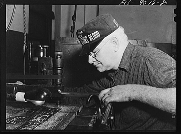 New York, New York. Photo engraving department of the New York Times newspaper. Routing a cut