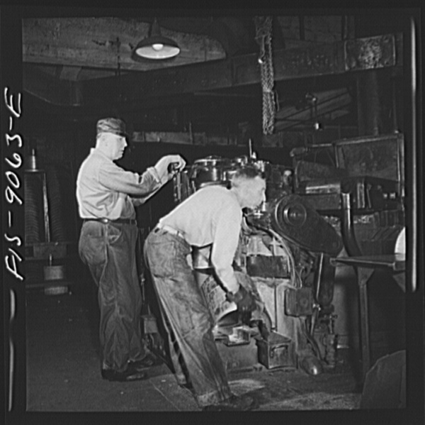 New York, New York. Pressroom of the New York Times newspaper. Casting of plates from mats in Autoplate machine