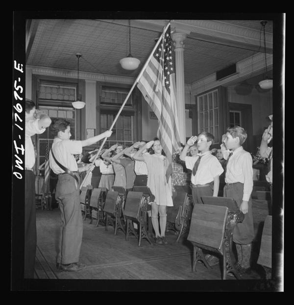 New York, New York students pledging allegiance to the flag in public school eight in an Italian-American section