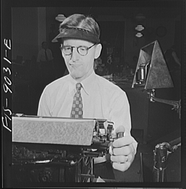 New York, New York. Telegraph room of the New York Times newspaper. Telegrapher on the direct wire from Washington, D.C.