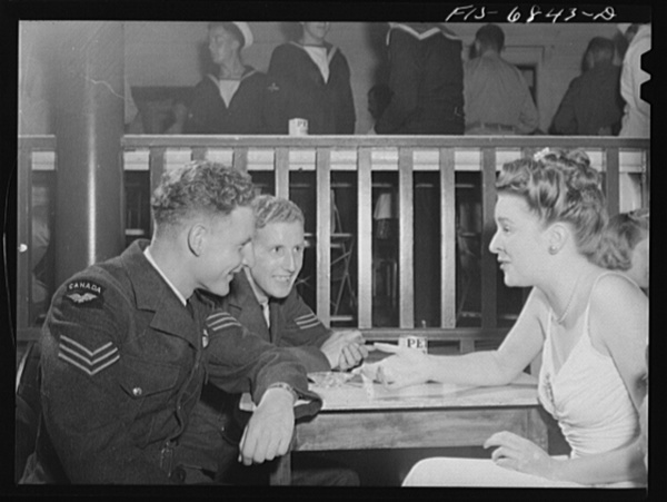 New York, New York. Two Canadian fliers talking with an Australian entertainer at the Stage Door canteen