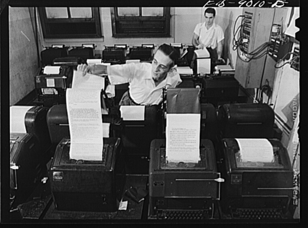 New York, New York. Wire room of the New York newspaper. Copy boy about to tear off dispatch from Associated Press wire