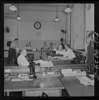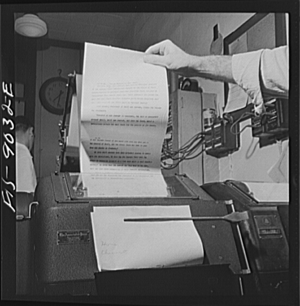 New York, New York. Wire room of the New York Times newspaper. Copy boy about to tear off dispatch coming over Associated Press