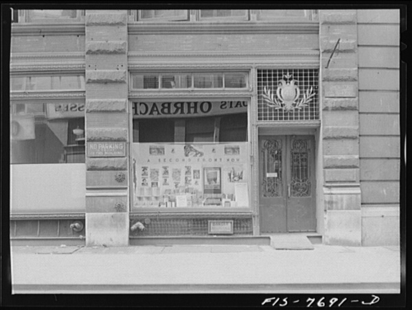 New York, New York. Workers' bookshop in a building on 13th Street between University Place and Broadway, which is the headquarters of the Communist party. No mention of Communism appears in the display or on the building